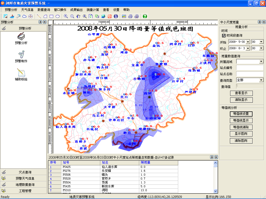 实现对中小尺度雨量的实时查询、历史查询,在地图上以数值点形式展示,在表格中查看详细信息,还可以快速生成等值图。